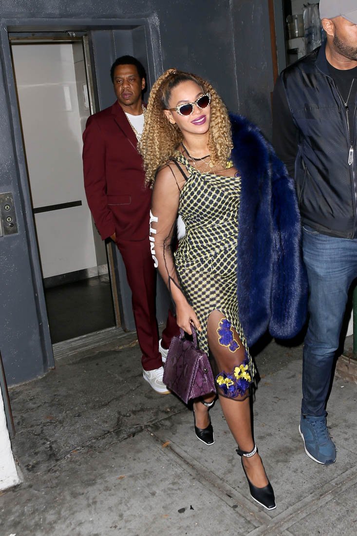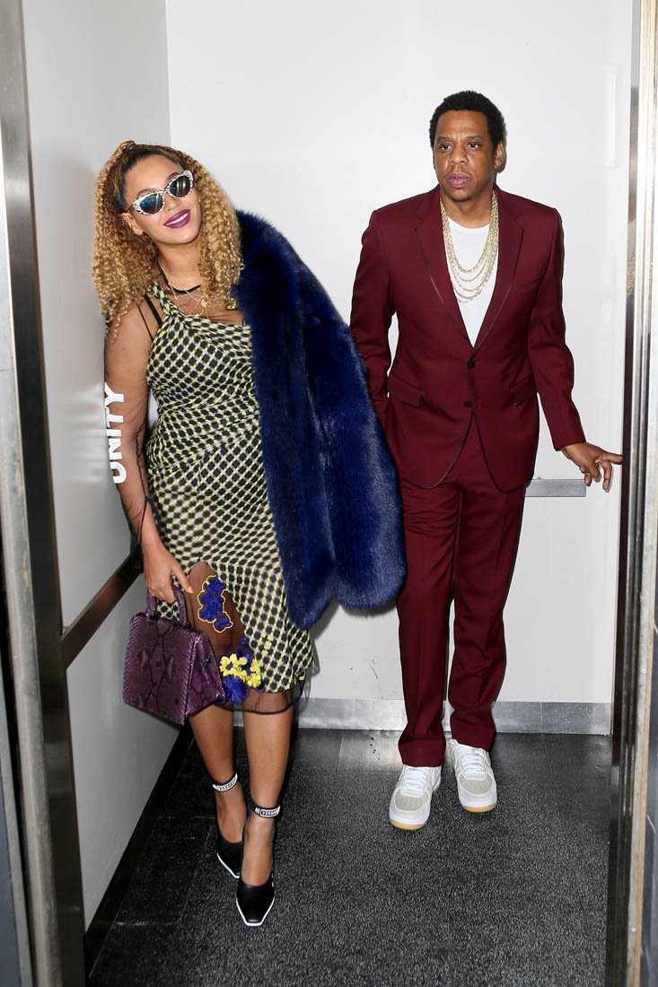 Hov, dressed in a dapper Gucci Signoria suit and DJ Clark Kent’s Nike Air Force 1 low top sneakers, and Bey, in Versace’s “Unity” dress and matching leather pumps, stunted for the paparazzi on their way out. Inside of an elevator, Hov allowed the paps to snap some photos. “Hurry up. Come get it,” he said, before holding the door open for flicks.