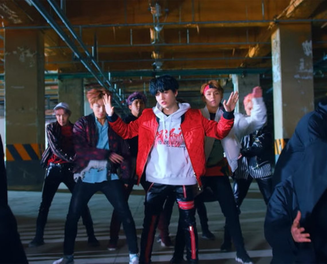 The video is a dance-heavy clip propelled by the song’s pounding rhythm, which is emphasized by the precise, stomping choreography. The video shows BTS leading a crowd of black-clad, seemingly ninja-inspired, dancers — who throw off their restricting garments at one point as if in protest– in military-style formations, while the rapidfire dances are interspersed with scenes of the BTS members being chased and shot at.